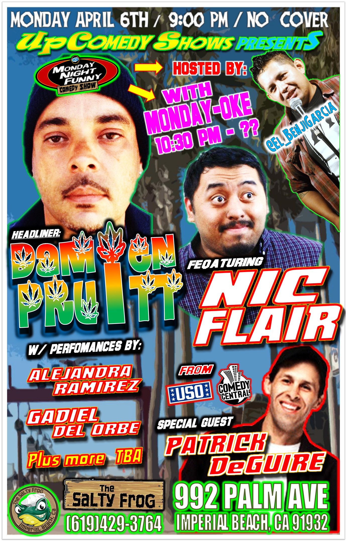 Monday Night Funny @ The Salty Frog presents Damien Pruitt 4/5, 9 pm, w Karaoke After! Posted bybengarciareyesApril 6, 2015September 10, 2015Posted inUncategorizedTags:Alejandra Ramirez, Benji GarciaReyes, Damien Pruitt, Monday Night Funny Comedy Show, Nic Flair, Patrick DeGuire, The Salty Frog Share this: Click to share on X (Opens in new window) X Click to share on Facebook (Opens in new window) Facebook Like Loading... Published by bengarciareyes Www.Faceboner.com www.UpComedyshows.com SanDiegoComedyShows.com View more posts