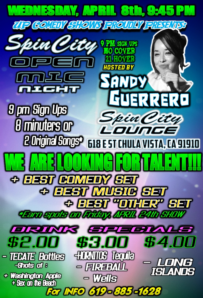 Spin City Comedy Presents: Open Mic Night w/ Sandy Guerrero! 4/8, No Cover, Sign ups 9:30 pm Posted bybengarciareyesApril 6, 2015September 10, 2015Posted inUncategorizedTags:Chula Vista Shows, Open Mic Night, Sandy GUerrero, Spin City Lounge Share this: Click to share on X (Opens in new window) X Click to share on Facebook (Opens in new window) Facebook Like Loading... Published by bengarciareyes Www.Faceboner.com www.UpComedyshows.com SanDiegoComedyShows.com View more posts