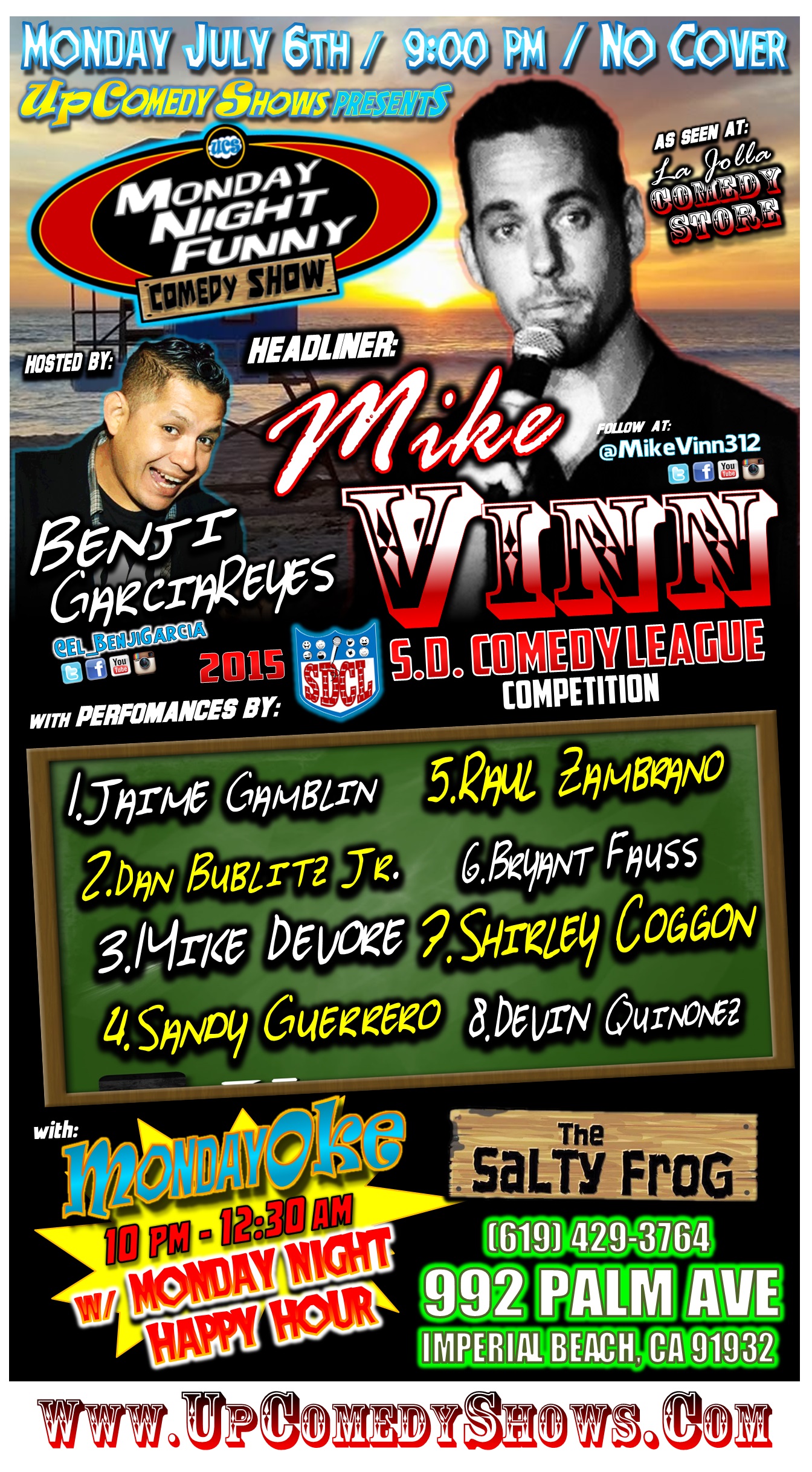 Monday Night Funny Show w/ MIke VInn, Feat. SD Comedy League Rnd1, Week 2 Showdown, 9 pm Posted bybengarciareyesJune 29, 2015September 10, 2015Posted inUncategorizedTags:21+, Benji GarciaReyes, Imperial Beach, MIke Vinn, Monday Night Funny, No Cover, San Diego Comedy League Competition, The Salty Frog Share this: Click to share on X (Opens in new window) X Click to share on Facebook (Opens in new window) Facebook Like Loading... Published by bengarciareyes Www.Faceboner.com www.UpComedyshows.com SanDiegoComedyShows.com View more posts