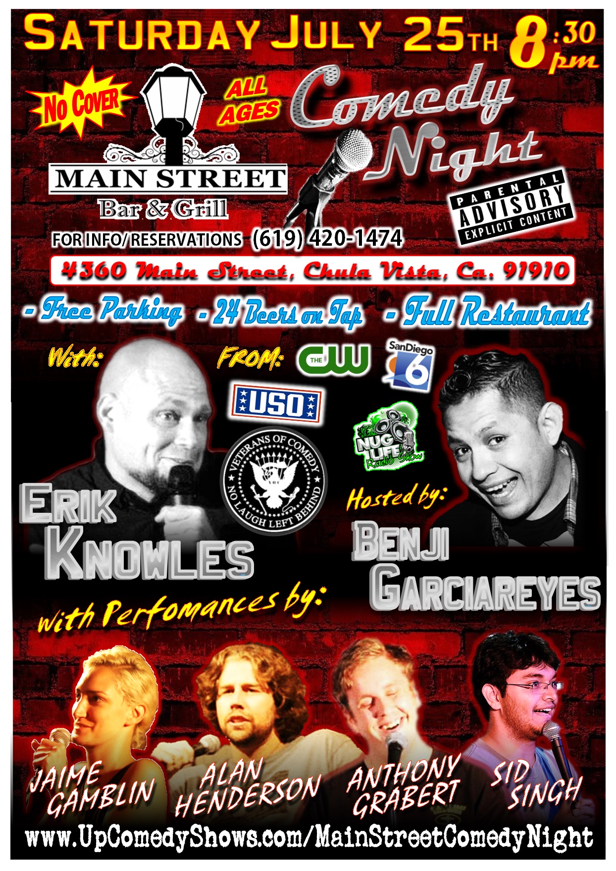 Next Main Street Comedy Night: Saturday July 25th, 8:30 PM, Still NO COVER & All Ages! Posted bybengarciareyesJuly 1, 2015September 10, 2015Posted inUncategorizedTags:24 beers on tap, all ages, Benji GarciaReyes, Chula Vista Shows, explicit material, full restaurant, Main Street Bar & Grill, No Cover, Spanish Stand Up COmedy Share this: Click to share on X (Opens in new window) X Click to share on Facebook (Opens in new window) Facebook Like Loading... Published by bengarciareyes Www.Faceboner.com www.UpComedyshows.com SanDiegoComedyShows.com View more posts