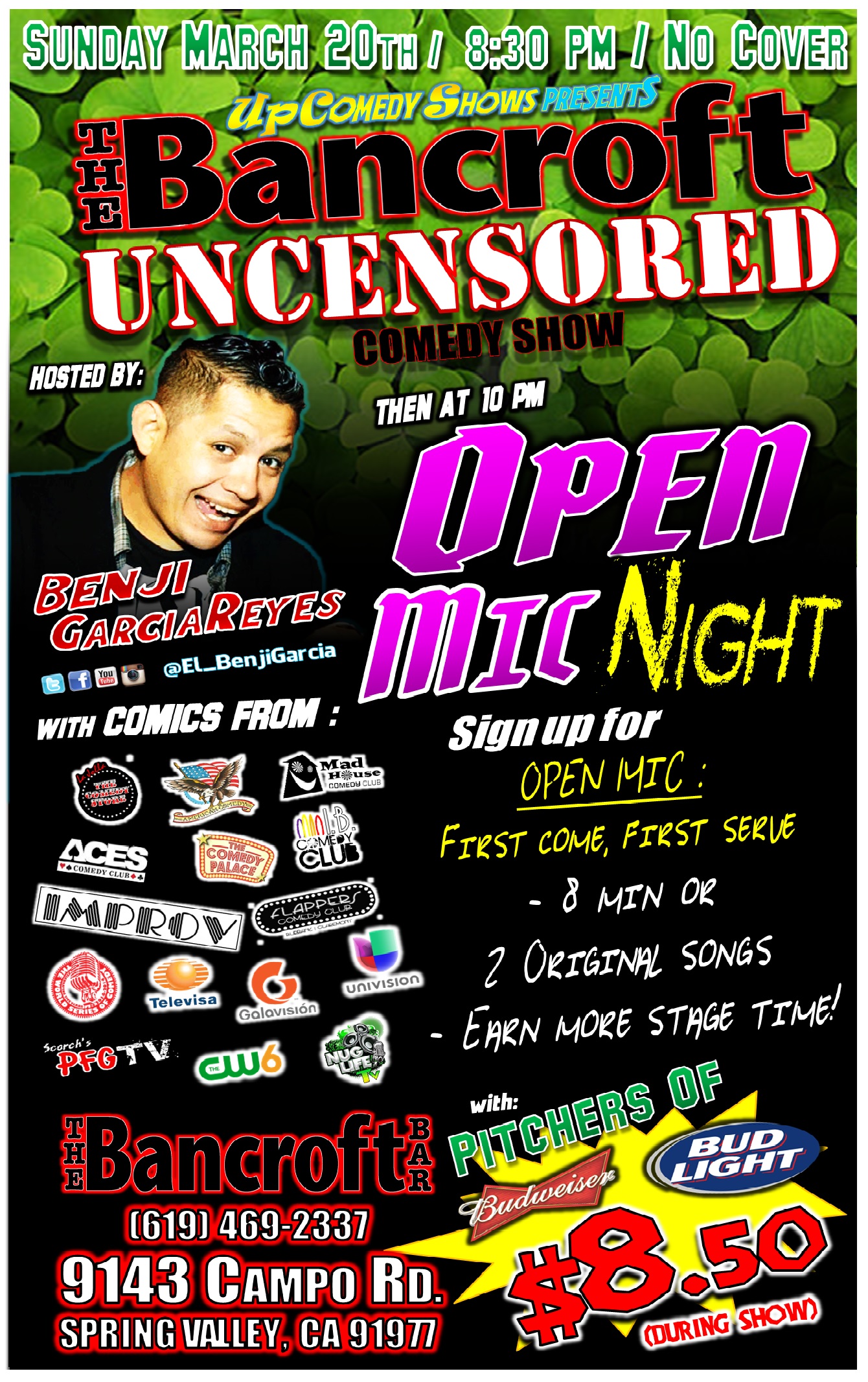 Bancroft Uncensored: Sun. March 20th Posted bybengarciareyesMarch 6, 2016August 20, 2017Posted inUp Comedy : Open Mics, Up Coming Shows Share this: Click to share on X (Opens in new window) X Click to share on Facebook (Opens in new window) Facebook Like Loading... Published by bengarciareyes Www.Faceboner.com www.UpComedyshows.com SanDiegoComedyShows.com View more posts