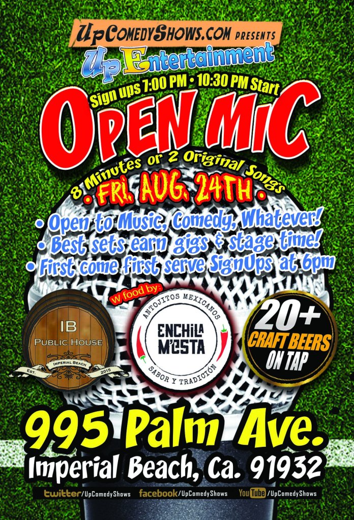 • Email UpComedyShows@Gmail.com to reserve a spot and coordinate if you are a musician, band or other types of communication needed with audio techs. Sign ups start at 7 pm, Open Mic Starts after IB Comedy Show.