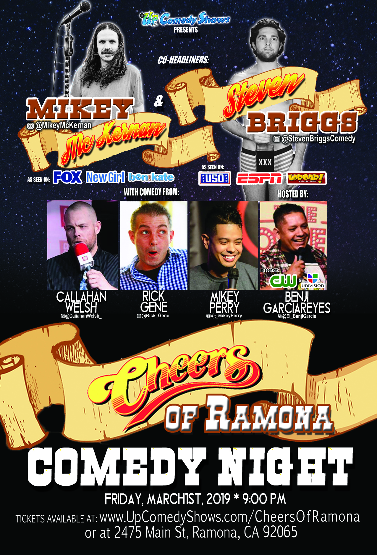 Friday, March 1st, your Cheers of Ramona and Up Comedy Shows present Comedy Night! Another evening of comedy guaranteed to make you laugh!