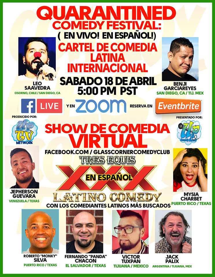 El Sábado 18 de abril, 5 pm, acompañenos para el Festival de comedia en cuarentena de The Glass Corner Comedy Club – “Quarantined Comedy Fest: Weekend 2: Show de Comedia virtual TRES EQUIS Showcase En Español!”.