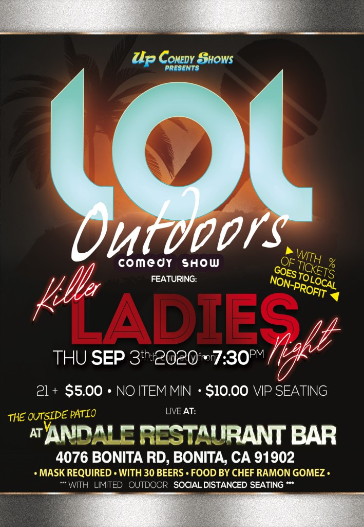 The next LOL Outdoors is Thursday Night, Sep. 3rd, 7:30 pm. With KARAOKE NIGHT AFTER THE SHOW. 21+, $5 gen, $10 VIP seats, no Item min.