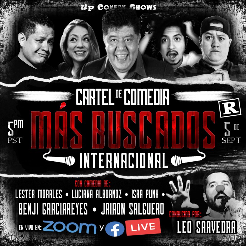 El Sábado 5 de Septiembre, 5 pm, acompañenos para el estreno de “El Cartel de Comedia: Más Buscados“, con lov emejor de lo mejor de comediantes . Todo en VIVO Via ZOOM y Facebook Live ( https://www.facebook.com/UpVirtualComedyClub/Live/ )