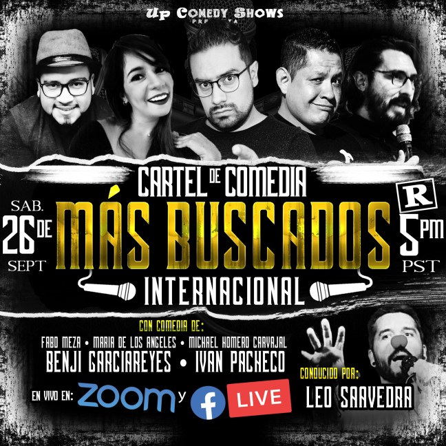 El Sábado 26 de Septiembre, 5 pm, acompañenos para el estreno de “El Cartel de Comedia: Más Buscados”, con lov emejor de lo mejor de comediantes . Todo en VIVO Via ZOOM y Facebook Live!