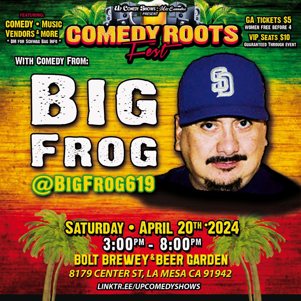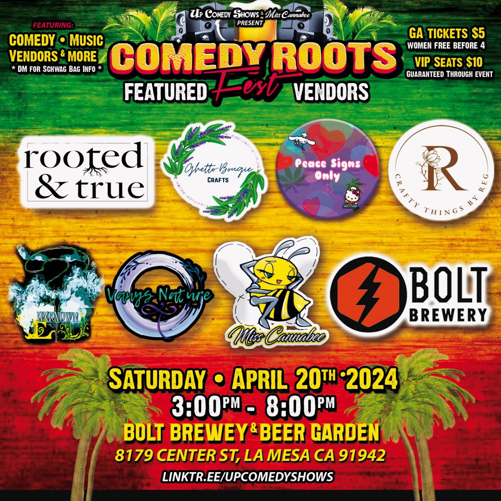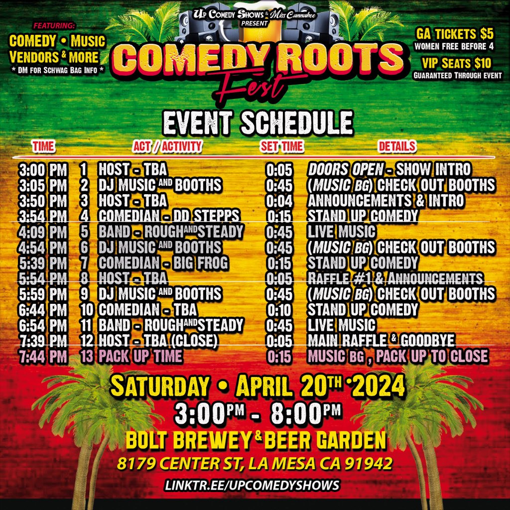 The 2024 San Diego Comedy Roots Festival is scheduled for Saturday, April 20th, 2024 at Bolt Brewing in La Mesa, Ca, right off the 8 Freeway.