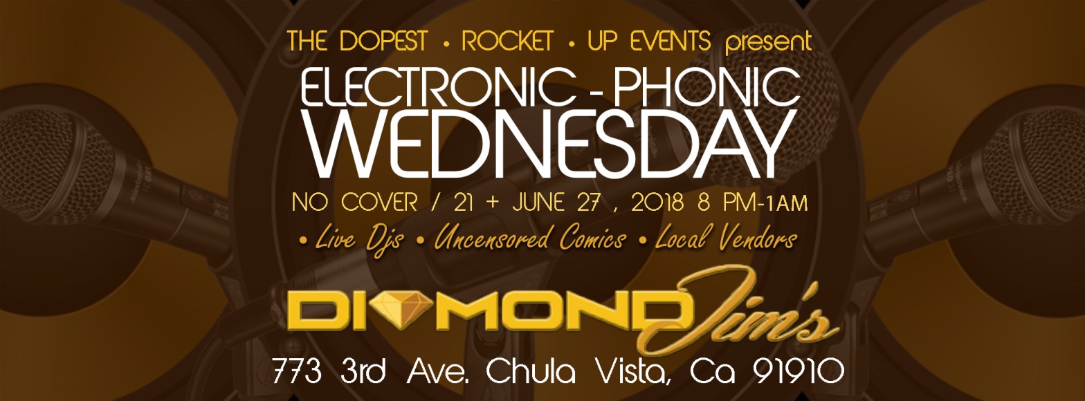 The Dopest • Rocket • Up events & Diamond Jim’s present: Electronic – Phonic WEDNESDAY Wednesday, June 27th for South Bay’s newest Comedian & Electronic Music experience. Music for the night by: GUEST The Dopest (Solbot) Deejay Holmes (The Yard) Stage Host: Benji Reyes Comedy by Big Frog Luis Sotelo + more TBA No CoverContinueContinue reading “PAST SHOWS: Electronic-Phonic Wednesday at Diamond Jim’s Chula Vista, June 27th”
